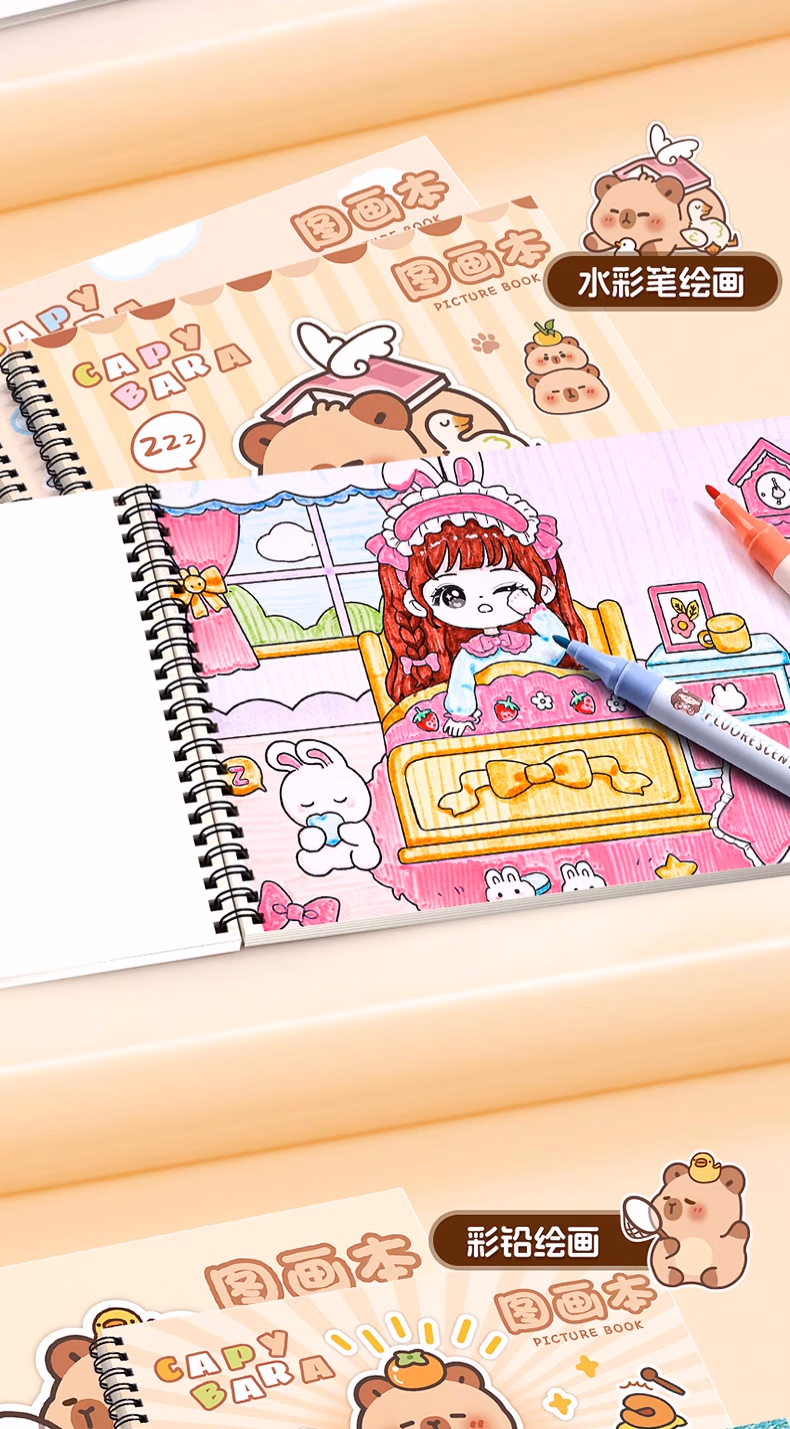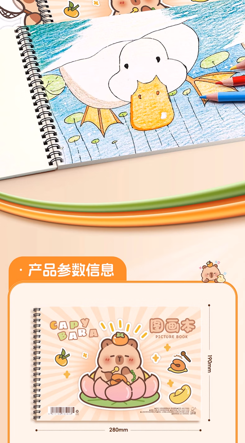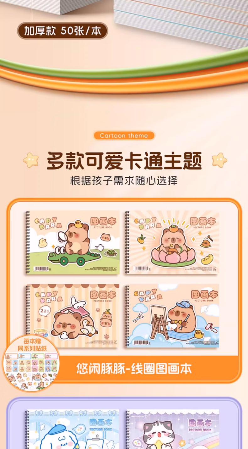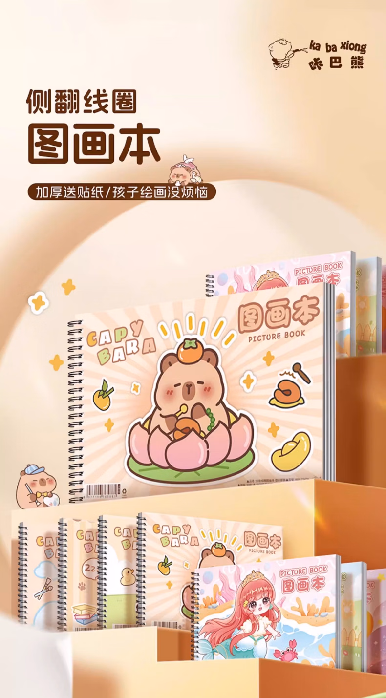 咔巴熊卡皮巴拉A4大号加厚图画本画画本绘画本儿童幼儿园小学生空白美术画纸涂鸦本线圈画册本不透色手绘 4本【卡皮巴拉】240页 贈100枚贴纸+姓名贴